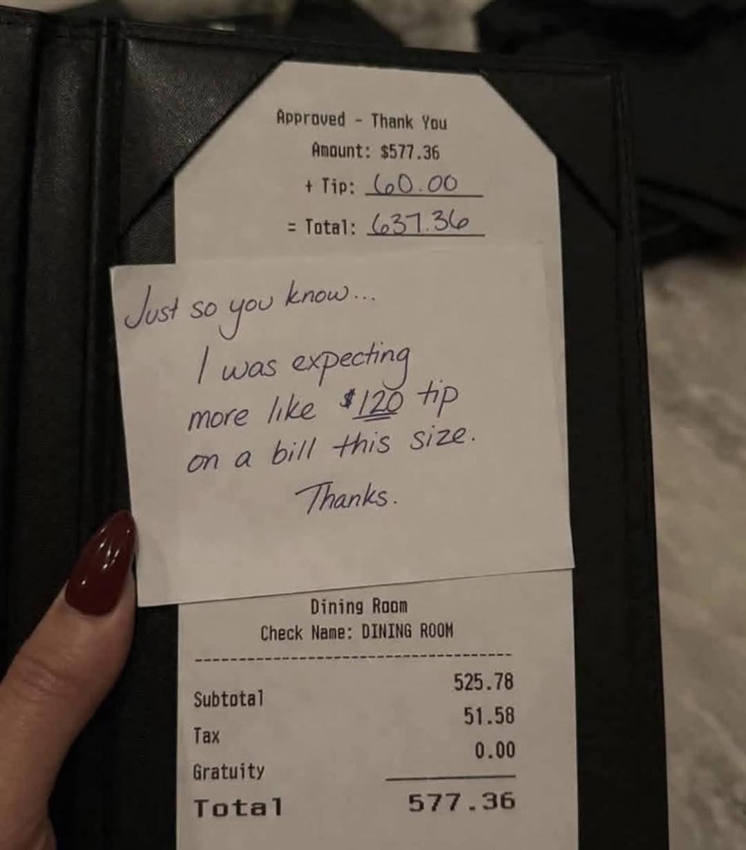 만약 서버(직원)가 계산서에 이런 걸 적어놨다면 사장님은 어떻게 했을 것 같아요? 메모: 참고로 말씀드리면…이 정도 금액의 계산서라면 팁은 약 120달러 정도를 기대했어요.감사합니다.
